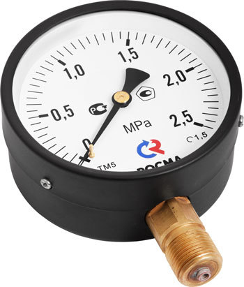 Манометр стандартный используется для измерения избыточного, вакууметрического давления неагресcивных к медным сплавам жидких и газообразных, не вязких и не кристаллизующихся сред с температурой до 150 °C. Корпус манометров в стандартном исполнении выполнен из стали, механизм — из латунного сплава. Принцип действия манометров основан на зависимости деформации чувствительного элемента от измеряемого давления. В качестве чувствительного элемента используется трубка Бурдона. Под воздействием измеряемого давления свободный конец трубки перемещается и с помощью специального механизма вращает стрелку манометра.